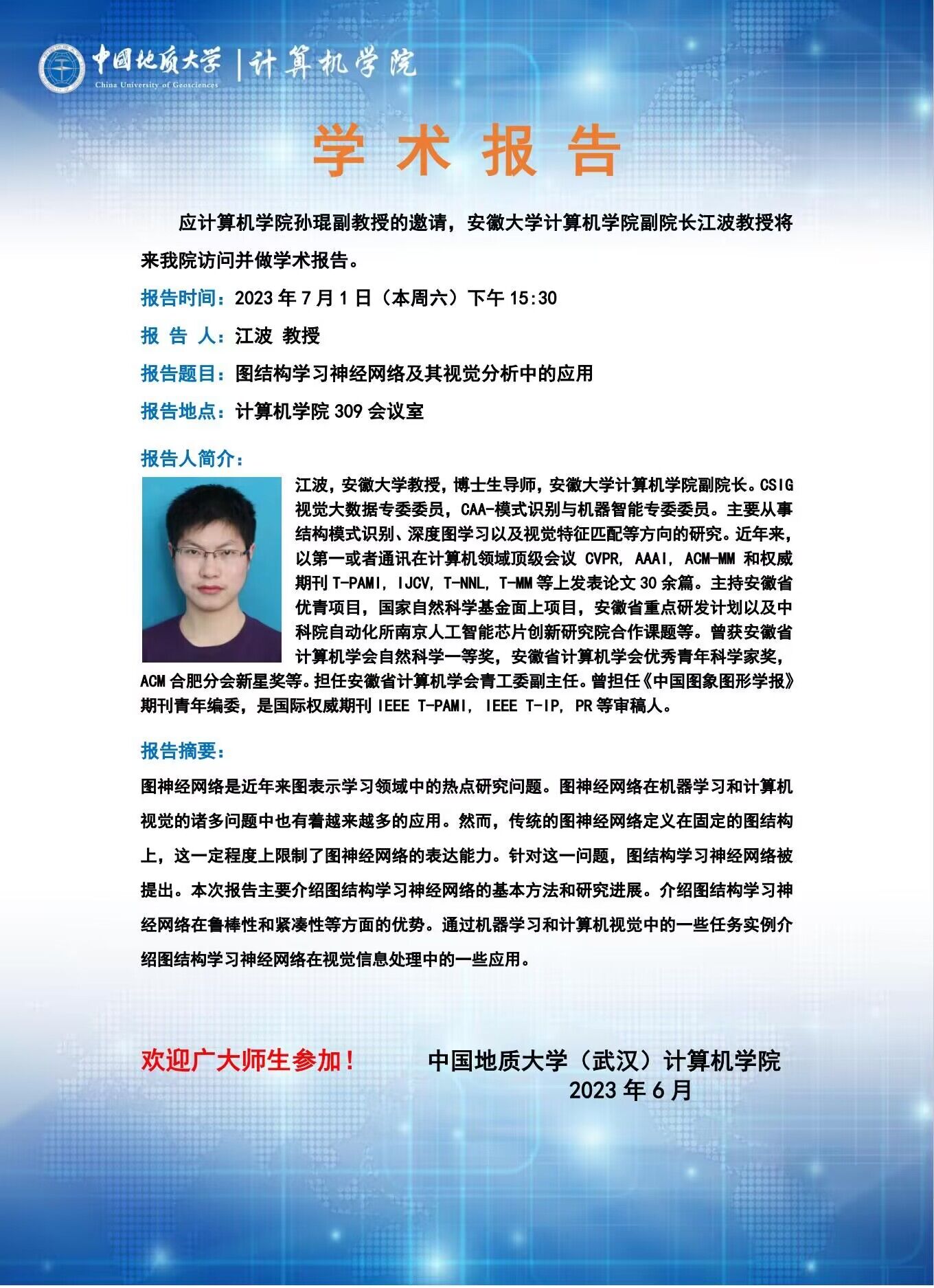 学术报告:安徽大学免费看a片 副院长江波教授——图结构学习神经网络及其视觉分析中的应用