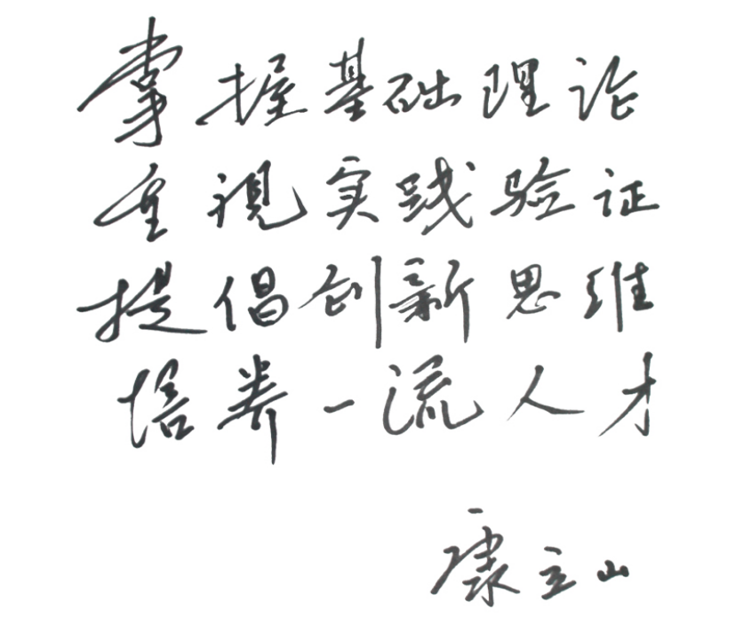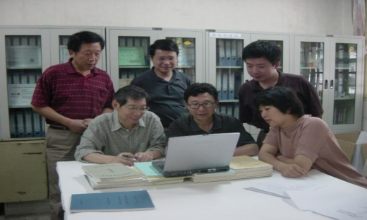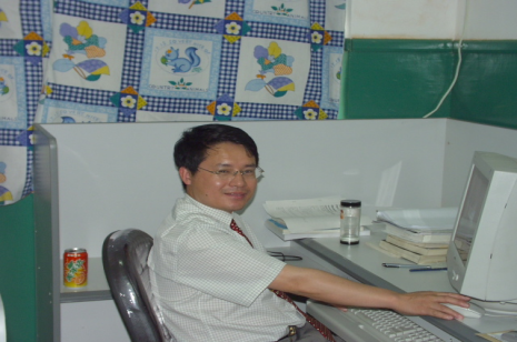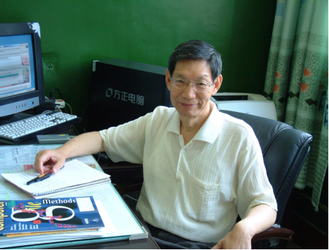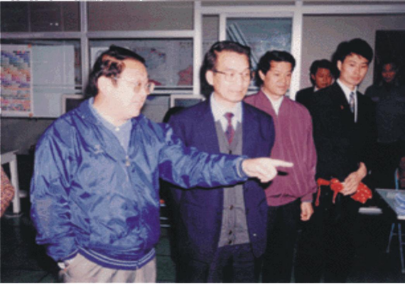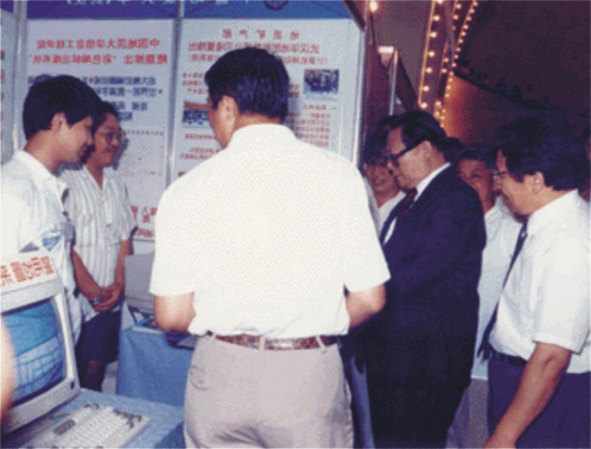 计算机系主任康立山指导参加挑战杯赛的学生(2004年5月)